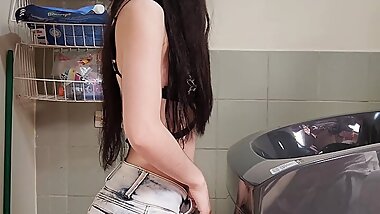 "Cheating neighbors, they have sex in the washing machine without their husbands finding out, sexy vesina gets fucked"