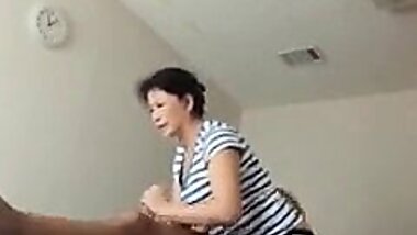 "Asian Mature caught Young Guy Jerk with her Panty and help him with Blowjob"